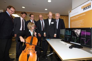Interesting research topics at the AudioLabs: Sensors enable the exact determination of a tone pitch while a cello is being played. (From left to right): Dr. Bernhard Grill, Deputy Director of Fraunhofer IIS; Prof. Dr. Joachim Hornegger, President of Friedrich-Alexander-Universität Erlangen-Nürnberg (FAU); Dr. Florian Janik, Mayor of Erlangen; Prof. Dr. Albert Heuberger, Speaker AudioLabs and Executive Director of Fraunhofer IIS; Fabian-Robert Stöter, scientific staff member AudioLabs; Prof. Dr. Alexander Kurz, Executive Vice President Human Resources, Legal Affairs and IP Management, Fraunhofer-Gesellschaft; Dr. Sybille Reichert, Chancellor of Friedrich-Alexander-Universität Erlangen-Nürnberg (FAU)