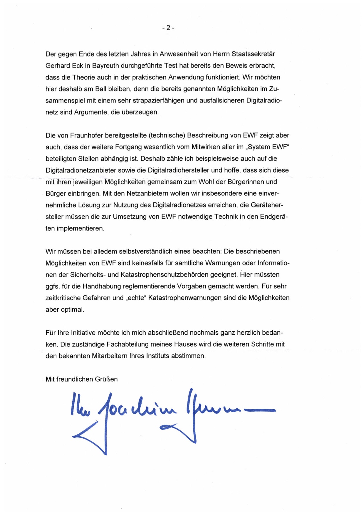 Eine schnelle und sachgerechte Warnung der Bevölkerung ist den Sicherheits- und Katastrophenschutzbehörden ein Kernanliegen, so der Staatsminister des Innern, für Bau und Verkehr. Da Digitalradio immer stärker genutzt wird, ermöglicht EWF mit seinen Eigenschaften wie etwa der direkten Ausstrahlung von Warnungen, deren automatische Wiedergabe auf den Endgeräten, sowie den zusätzlichen Informationen in Textform via Journaline, eine sinnvolle Ergänzung zum bestehenden Warnsystem über Radio, so der Minister weiter.